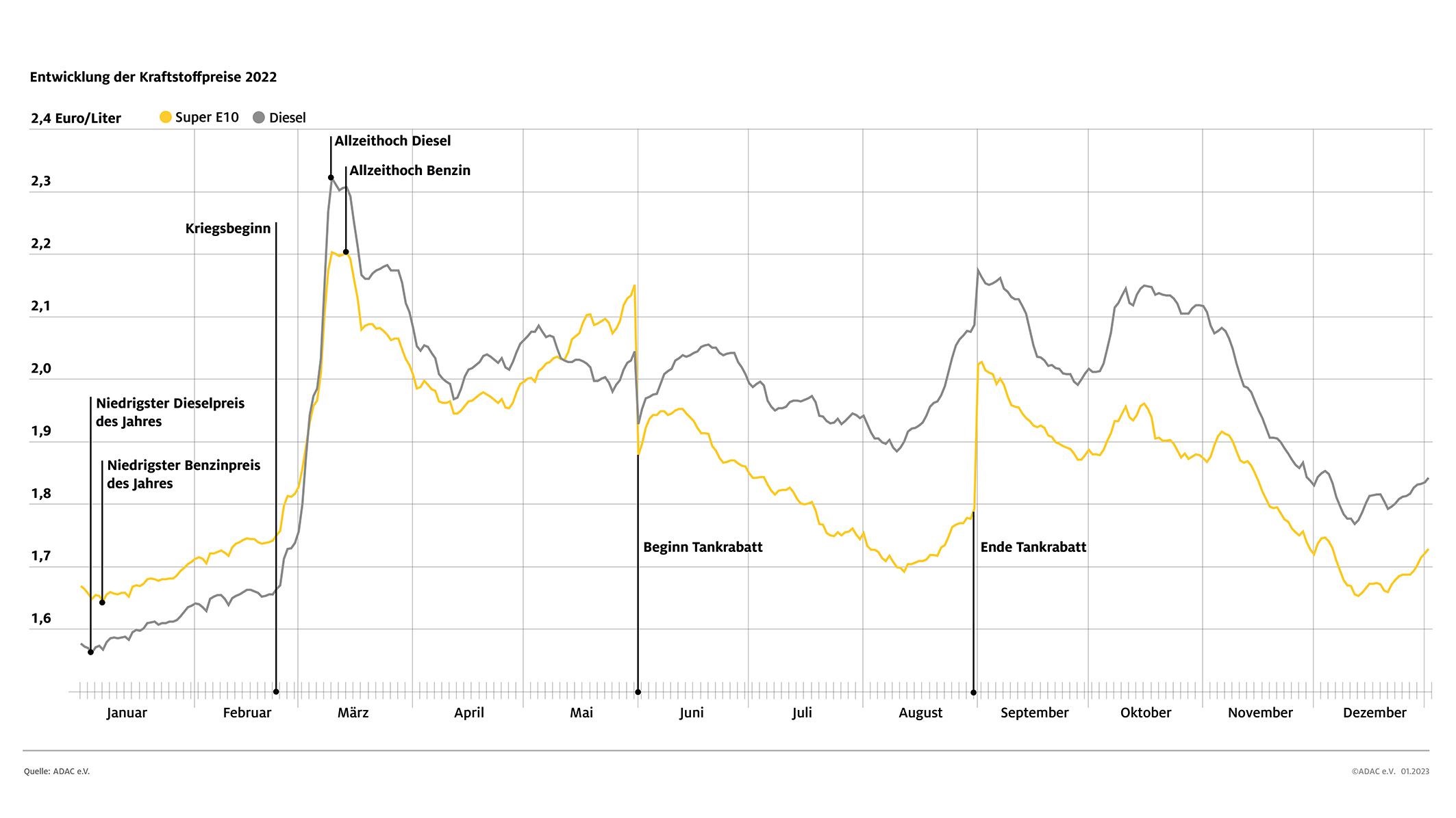 Die überaus starke Verteuerung im Vergleich zum Vorjahr ist auf viele Faktoren zurückzuführen. Unsicherheiten bezüglich des Ukraine-Kriegs, Lieferengpässe und -schwierigkeiten, steigende industrielle Nachfrage nach Diesel sowie eine Entkoppelung der Preise an den Tankstellen von den Rohölnotierungen kennzeichneten den Markt. Aber auch die Margen der Raffinerien sind deutlich gestiegen. So verzwölffachte sich die Brutto-Raffineriemarge in Deutschland in den ersten elf Monaten des Jahres 2022 gegenüber dem Vergleichszeitraum des Vorjahres. Nach Ansicht des ADAC lagen die Kraftstoffpreise 2022 insgesamt auf einem viel zu hohen Niveau. Das Potenzial für künftige Preisnachlässe ist gerade bei Dieselkraftstoff noch erheblich, denn für einen Liter Diesel fallen gut 20 Cent weniger Steuern an. Tatsächlich liegt der Dieselpreis im Jahresdurchschnitt aber um mehr als acht Cent über dem von Super E10.