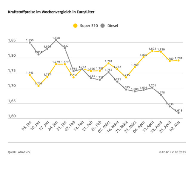 München (ots) – Die Differenz zwischen Benzin- und Dieselpreis hat sich erneut vergrößert und beträgt jetzt 17,3 Cent. Gründe für die Ausweitung des Preisunterschieds sind die leichte Verteuerung bei Benzin und der Rückgang des Dieselpreises. Laut aktueller ADAC Auswertung der Kraftstoffpreise in Deutschland kostet ein Liter Super E10 im bundesweiten Mittel 1,791 Euro und damit 0,2…