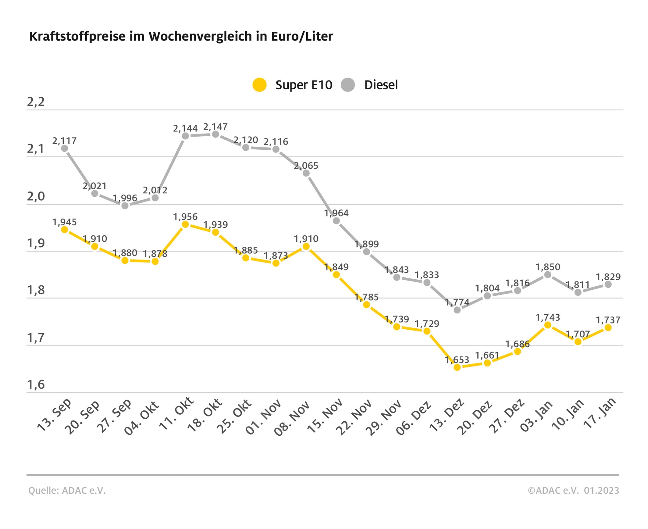 München (ots) – Die Kraftstoffpreise in Deutschland ziehen wieder spürbar an, dies ist das Ergebnis der aktuellen ADAC Auswertung. So kostet ein Liter Super E10 im bundesweiten Mittel derzeit 1,737 Euro und damit drei Cent mehr als vor einer Woche. Etwas geringer fällt der Anstieg bei Diesel aus: Ein Liter kostet aktuell 1,829 Euro – ein Plus von 1,8 Cent im Wochenvergleich.