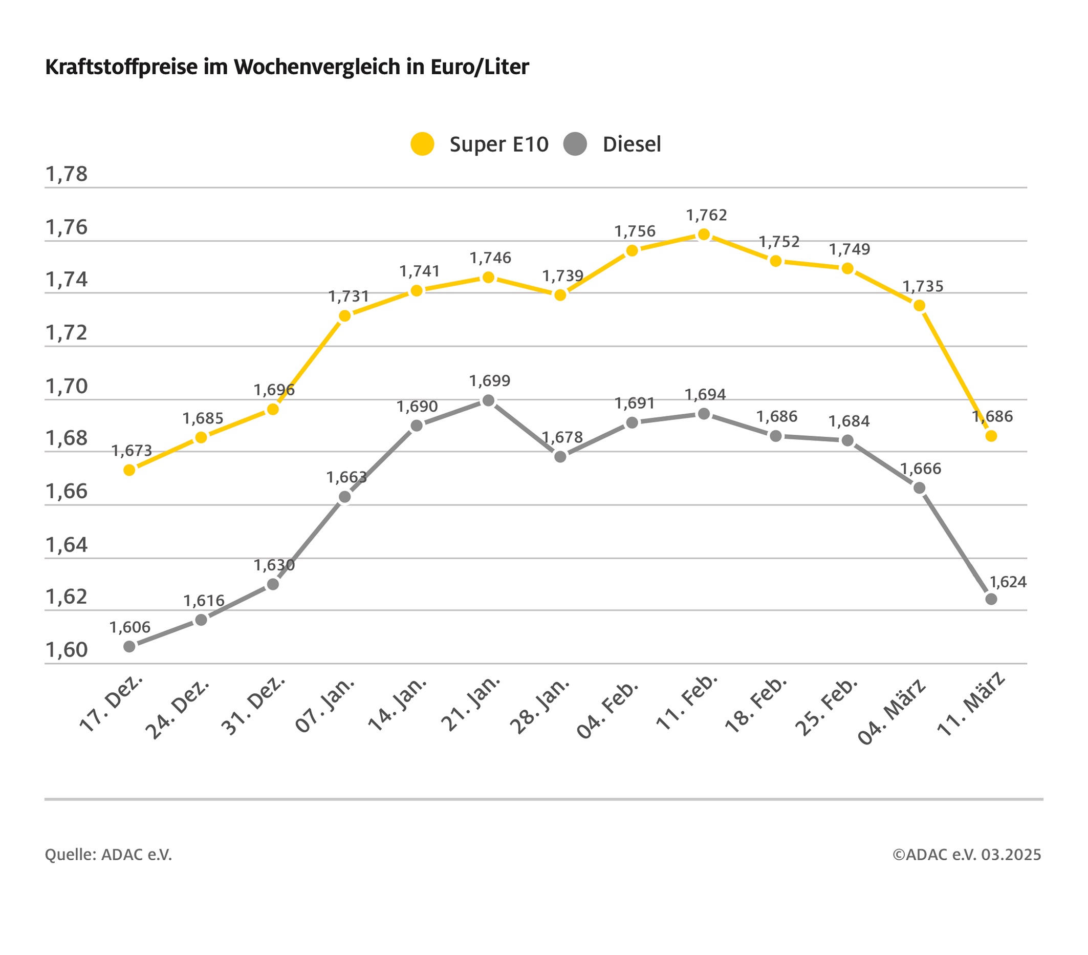 München (ots) – Tanken ist gegenüber der Vorwoche deutlich billiger geworden, die Preise beider Kraftstoffsorten sind kräftig gesunken – das zeigt die aktuelle ADAC Auswertung der Kraftstoffpreise in Deutschland. Danach kostet ein Liter Super E10 im bundesweiten Mittel 1,686 Euro und damit 4,9 Cent weniger als vor einer Woche. Der Dieselpreis ging um 4,2 Cent zurück und liegt aktuell im Schnitt bei 1,624 Euro. Damit befinden sich beide Kraftstoffpreise auf einem neuen Jahrestief. Noch preiswerter als jetzt war Tanken letztmals Ende 2024.