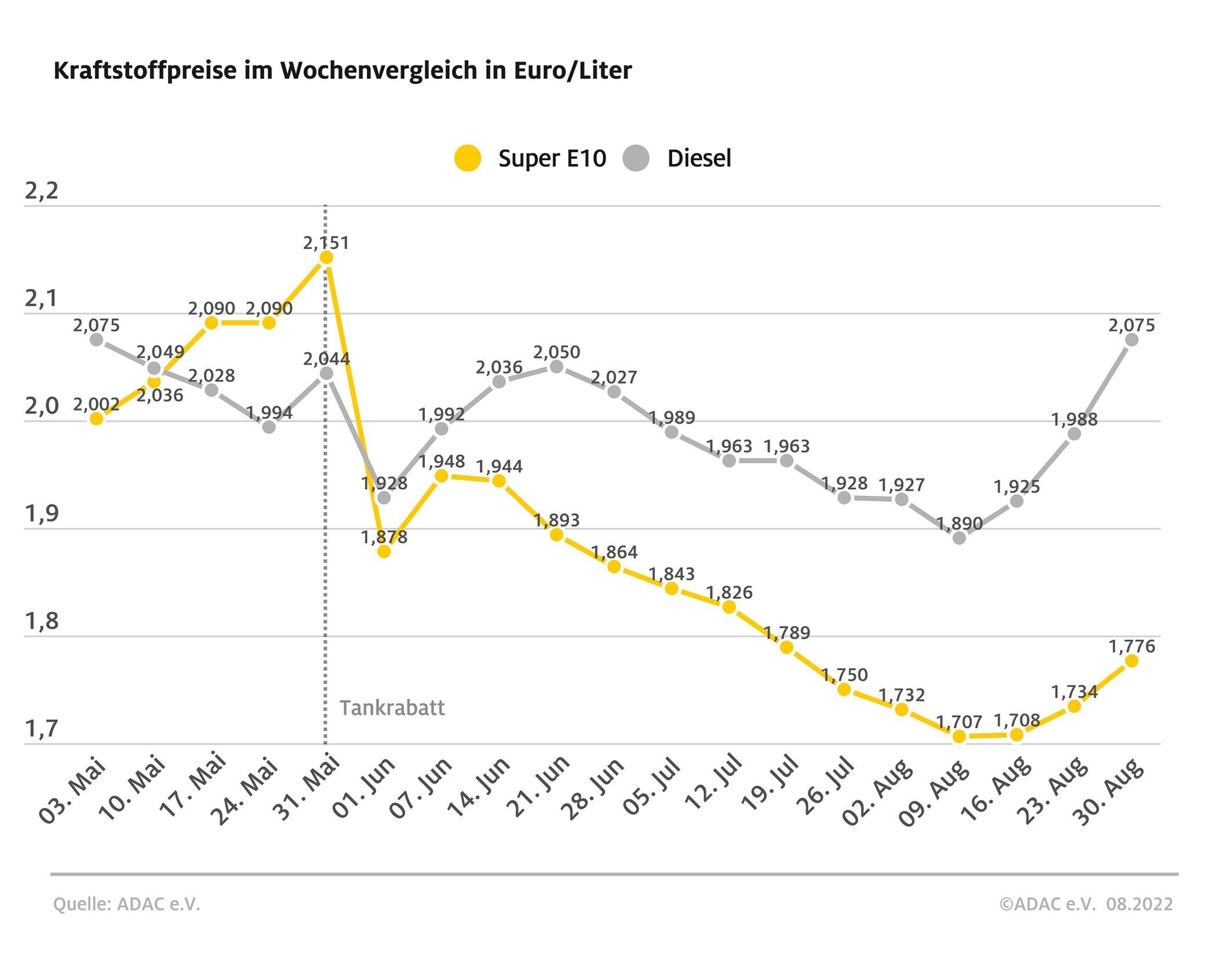 München (ots) – Bereits vor dem offiziellen Ende des Tankrabatts ziehen die Kraftstoffpreise kräftig an. Das ermittelt der ADAC in seiner wöchentlichen Auswertung der Spritpreise. Ein Liter Super E10 kostet derzeit im bundesweiten Mittel 1,776 Euro. Im Vergleich zu Vorwoche entspricht das einem Anstieg von 4,2 Cent. Beim Diesel ist der Preissprung noch größer. Ein Liter kostet derzeit im Bundesschnitt 2,075 Euro – 8,7 Cent mehr als noch vor einer Woche.