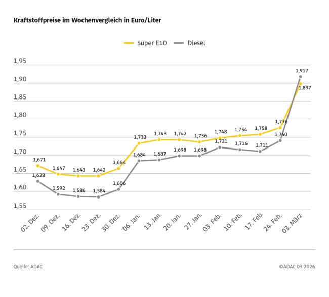 München (ots) – Der Krieg im Iran und in der Golfregion hat zu einem dramatischen Anstieg der Kraftstoffpreise geführt. Wie die aktuelle ADAC Auswertung der Kraftstoffpreise in Deutschland zeigt, kostet ein Liter Super E10 im bundesweiten Mittel 1,897 Euro. Damit hat sich Super E10 gegenüber der Vorwoche um 12,1 Cent verteuert. Um einiges deutlicher noch…