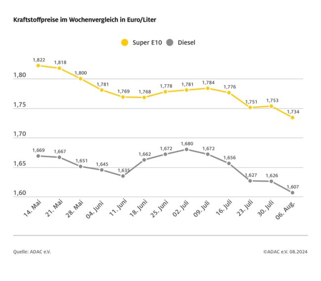München (ots)Tanken ist im Vergleich zur Vorwoche noch ein kleines bisschen günstiger geworden. Wie die wöchentliche ADAC Auswertung der Kraftstoffpreise in Deutschland zeigt, kostet ein Liter Super E10 im bundesweiten Mittel 1,733 Euro und damit 0,1 Cent weniger als vor einer Woche. Diesel hat sich um 0,4 Cent verbilligt und kostet derzeit im Schnitt 1,603…