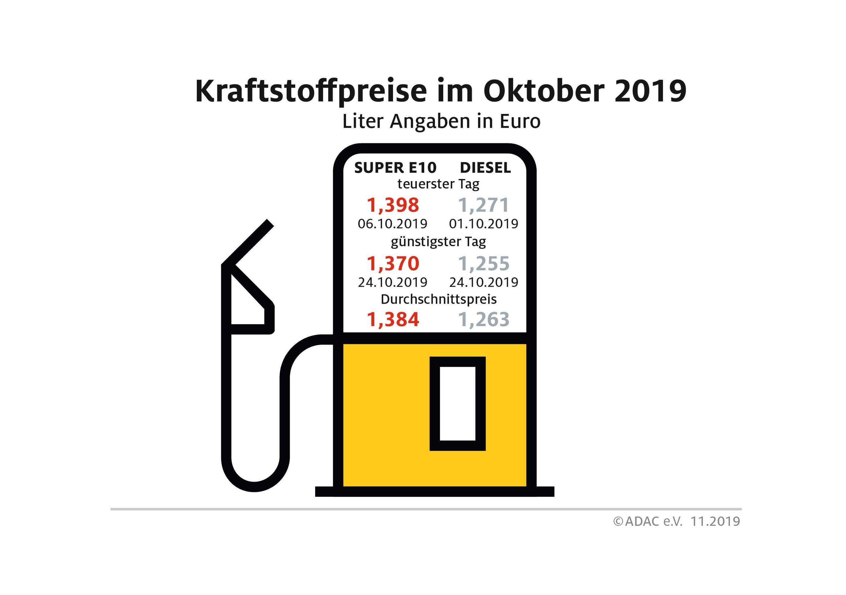 Der Preistrend der Vormonate setzte sich beim Tanken auch im Oktober fort. Laut der monatlichen Marktauswertung des ADAC kostete ein Liter Super E10 im Oktober im Bundesdurchschnitt 1,384 Euro, das sind 1,3 Cent weniger als im September und ist zum fünften Mal in Folge weniger als im jeweiligen Vormonat. Diesel hingegen verteuerte sich gegenüber September um 0,3 Cent auf durchschnittlich 1,263 Euro je Liter. Das ist der zweite Preisanstieg in Folge.