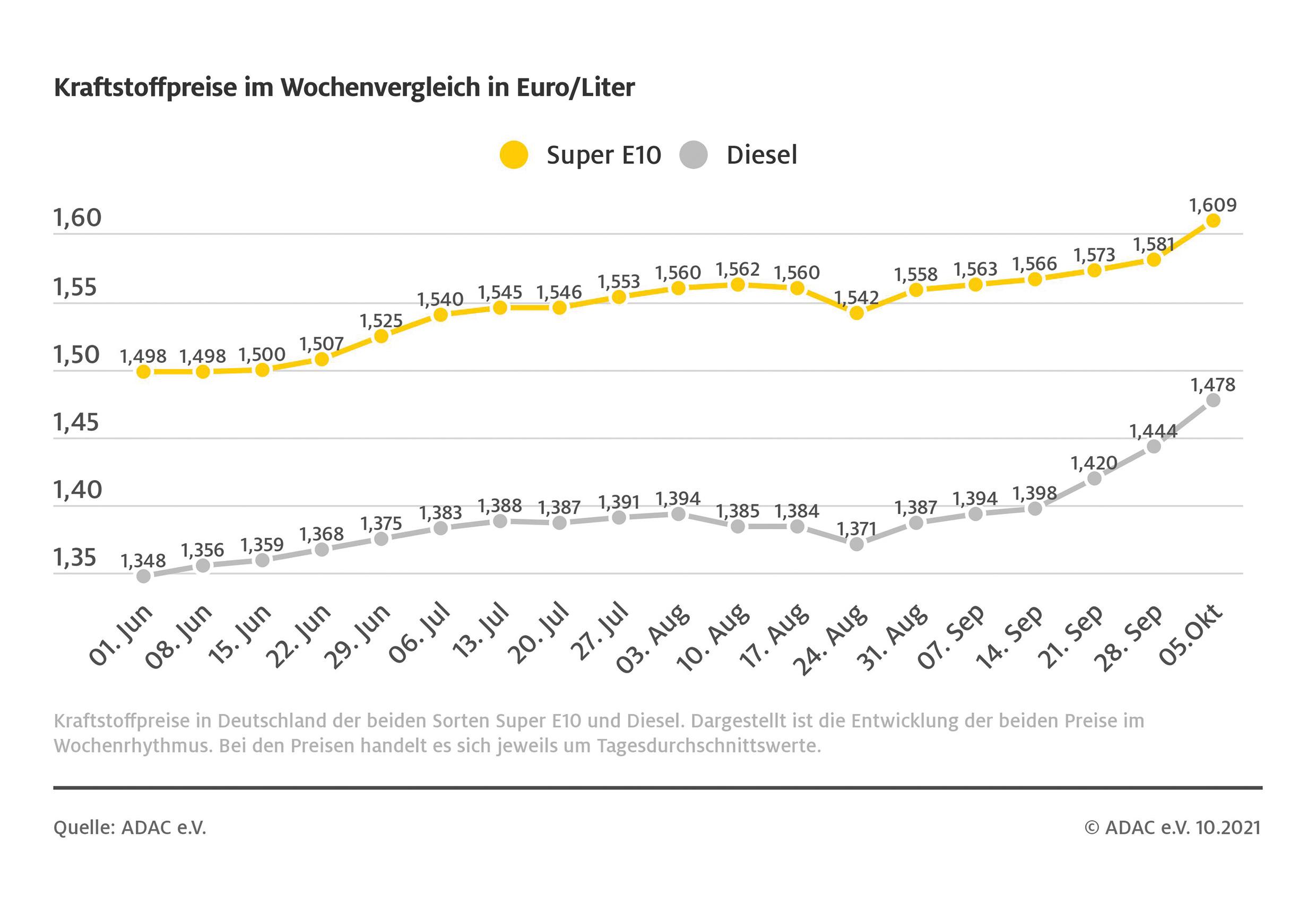 Tanken wird zurzeit immer teurer: Für einen Liter Super E10 müssen die Autofahrer derzeit im bundesweiten Mittel 1,609 Euro bezahlen – das sind 2,8 Cent mehr als in der vergangenen Woche. Noch stärker ist der Preis für Diesel gestiegen. Ein Liter kostet aktuell 1,478 Euro und liegt damit um 3,4 Cent über dem Vorwochenpreis. Dies zeigt die aktuelle ADAC Auswertung der Kraftstoffpreise in Deutschland. Die Ursache für den kräftigen Preisaufschlag liegt in den deutlich höheren Rohölnotierungen. So kostet ein Barrel Rohöl der Sorte Brent auf dem Weltmarkt derzeit rund 83 US-Dollar – fünf Dollar mehr als in der Vorwoche.