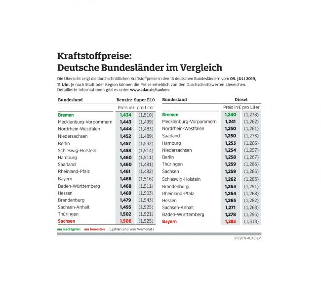 München (ots) Die Durchschnittspreise für Benzin und Diesel in den Bundesländern weisen erkennbare Unterschiede auf. Am günstigsten tanken Autofahrer derzeit im Stadtstaat Bremen: Ein Liter Super E10 ist hier mit durchschnittlich 1,434 Euro um 7,2 Cent billiger als im teuersten Bundesland Sachsen (1,506 Euro). Ein Liter Diesel kostet in Bremen im Mittel 1,240 Euro und damit…