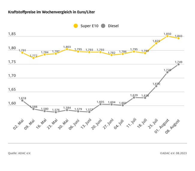 Spritpreise im Wochenvergleich erneut gestiegen – Differenz zwischen Diesel und Super E10 sinkt weiter