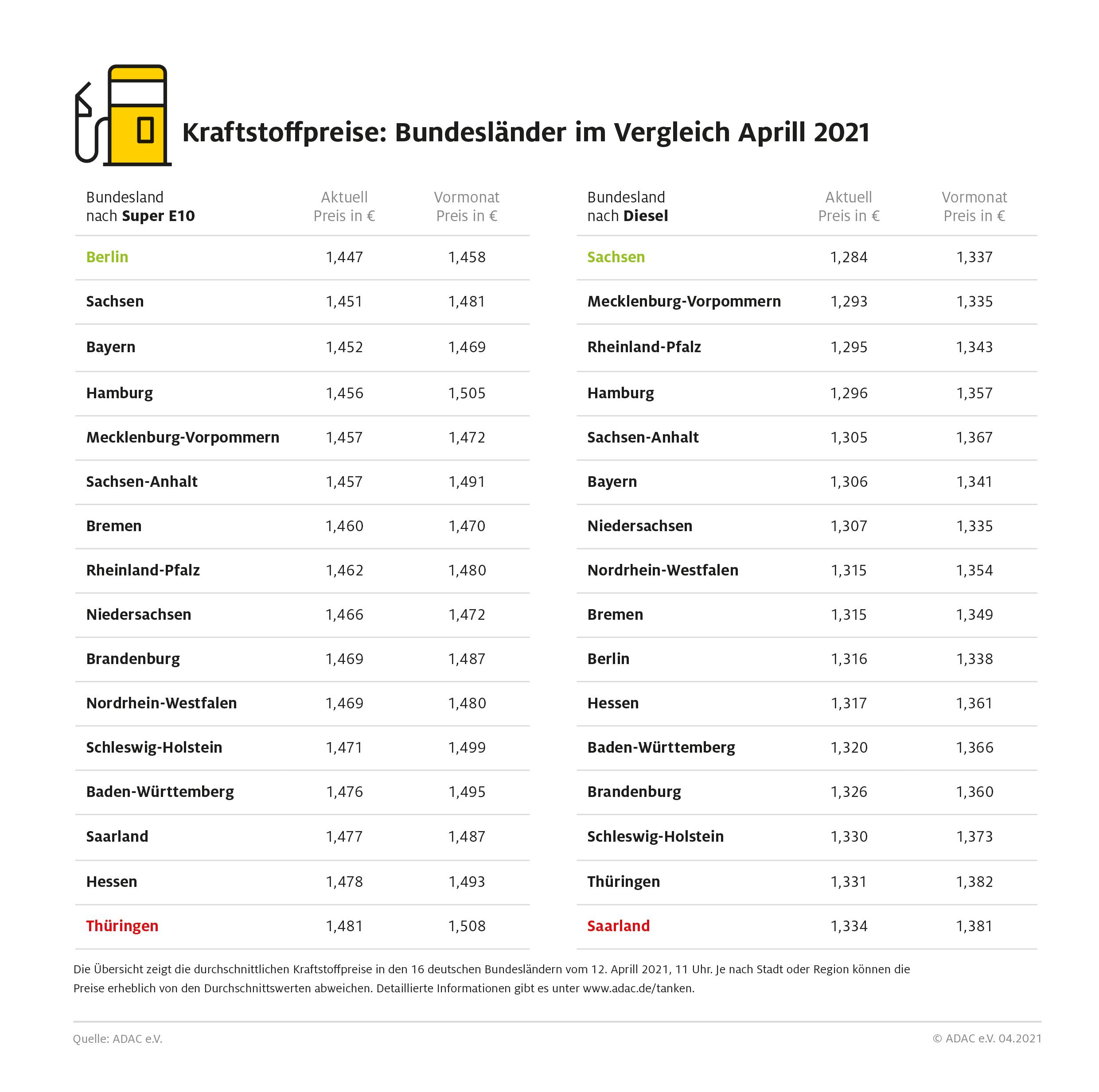 In der aktuellen Untersuchung hat der ADAC am Dienstag um 11 Uhr die Preisdaten von mehr als 14.000 bei der Markttransparenzstelle erfassten Tankstellen ausgewertet und den Bundesländern zugeordnet. Die ermittelten Preise stellen eine Momentaufnahme dar. Unkomplizierte und schnelle Hilfe für preisbewusste Autofahrer bietet die Smartphone-App „ADAC Spritpreise“. Ausführliche Informationen rund um den Kraftstoffmarkt gibt es zudem unter www.adac.de/tanken.