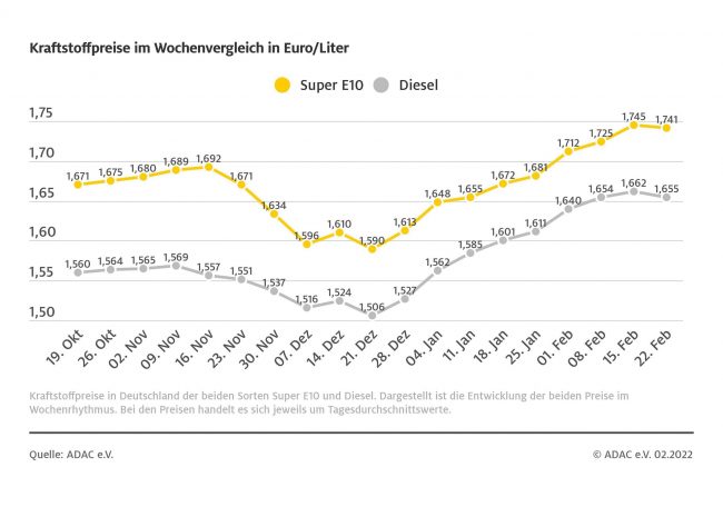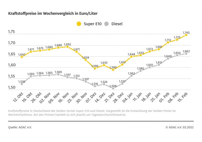 München (ots) – Die Kraftstoffpreise sind im Februar erneut deutlich gestiegen. Beide Sorten kletterten am Monatsende auf neue Allzeithochs und auch im Monatsmittel wurden neue Rekordmarken erreicht. Dies zeigen die Daten des ADAC in seiner monatlichen Auswertung der Kraftstoffpreise. Danach kostete ein Liter Super E10 im Monatsdurchschnitt 1,742 Euro und damit 7,2 Cent mehr als im…