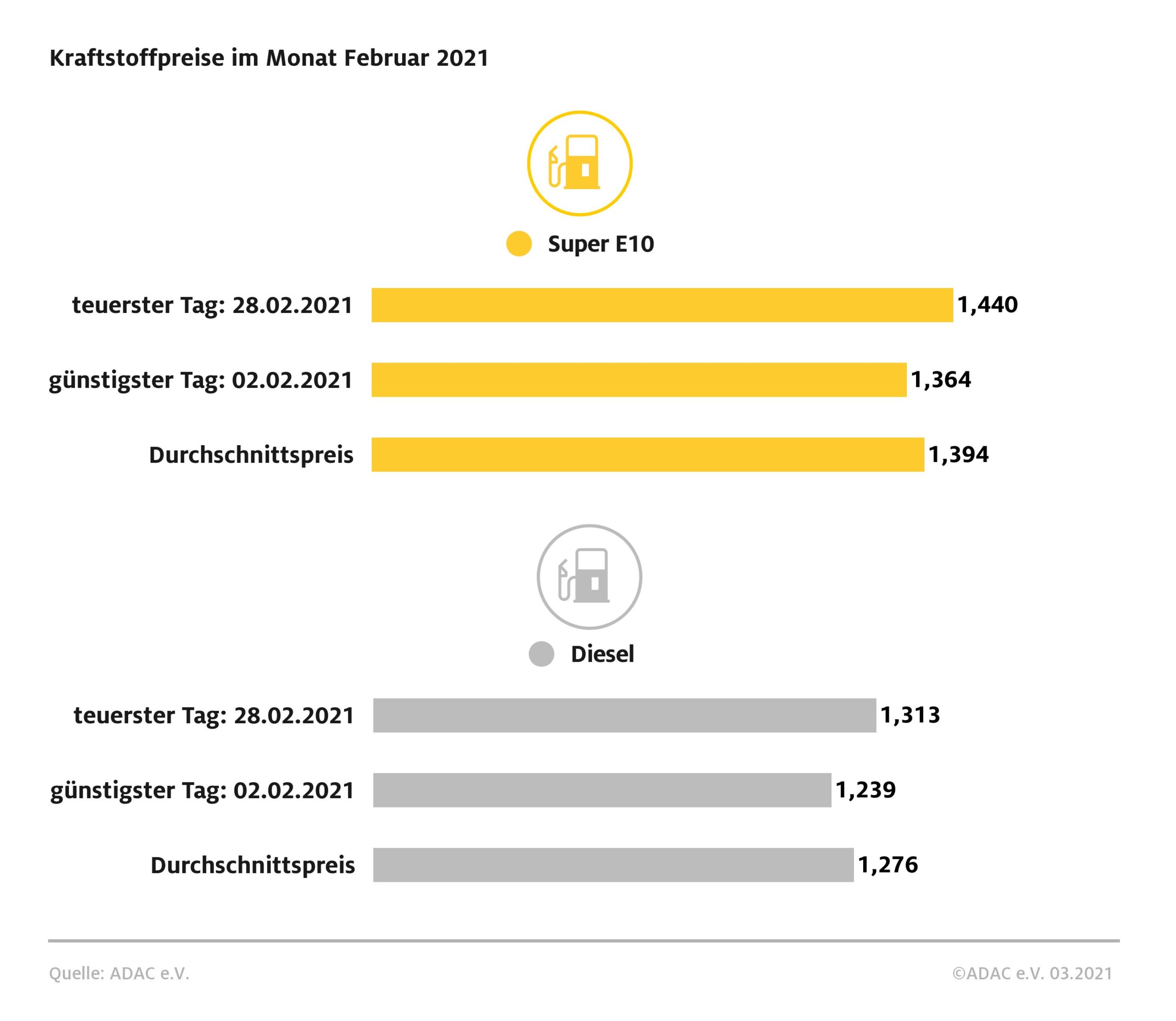 Der Preisanstieg an den deutschen Tankstellen hat sich im Februar fortgesetzt. Sowohl Benzin als auch Diesel verteuerten sich im Mittel im Vergleich zum Januar um jeweils 4,3 Cent je Liter. Dies zeigt die monatliche ADAC Auswertung der Kraftstoffpreise. Danach mussten die Fahrer von Benziner-Pkw im Monatsmittel 1,394 Euro je Liter Super E10 bezahlen. Diesel kostete im Schnitt 1,276 Euro.