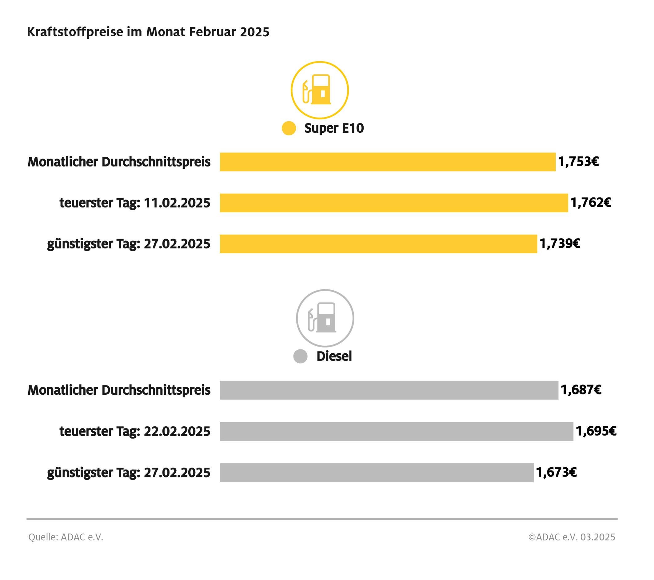 München (ots) – Tanken war im Februar etwas teurer als im Januar, obwohl die Kraftstoffpreise eigentlich hätten sinken müssen. Der zentrale Grund: Im Januar notierte Öl der Sorte Brent durchgehend über 75 US-Dollar je Barrel, zum Teil sogar deutlich über der Marke von 80 US-Dollar. Im Februar lag der Ölpreis dagegen fast durchgehend mehrere Dollar niedriger als im Vormonat. Ganz anders hingegen die Kraftstoffpreise, wie die aktuelle ADAC Auswertung vom Februar zeigt. Danach kostete ein Liter Super E10 im bundesweiten Mittel 1,753 Euro, das waren 1,6 Cent mehr als im Vormonat. Auch Diesel verteuerte sich im Monatsvergleich, und zwar um 0,9 Cent von 1,678 Euro je Liter auf 1,687 Euro.