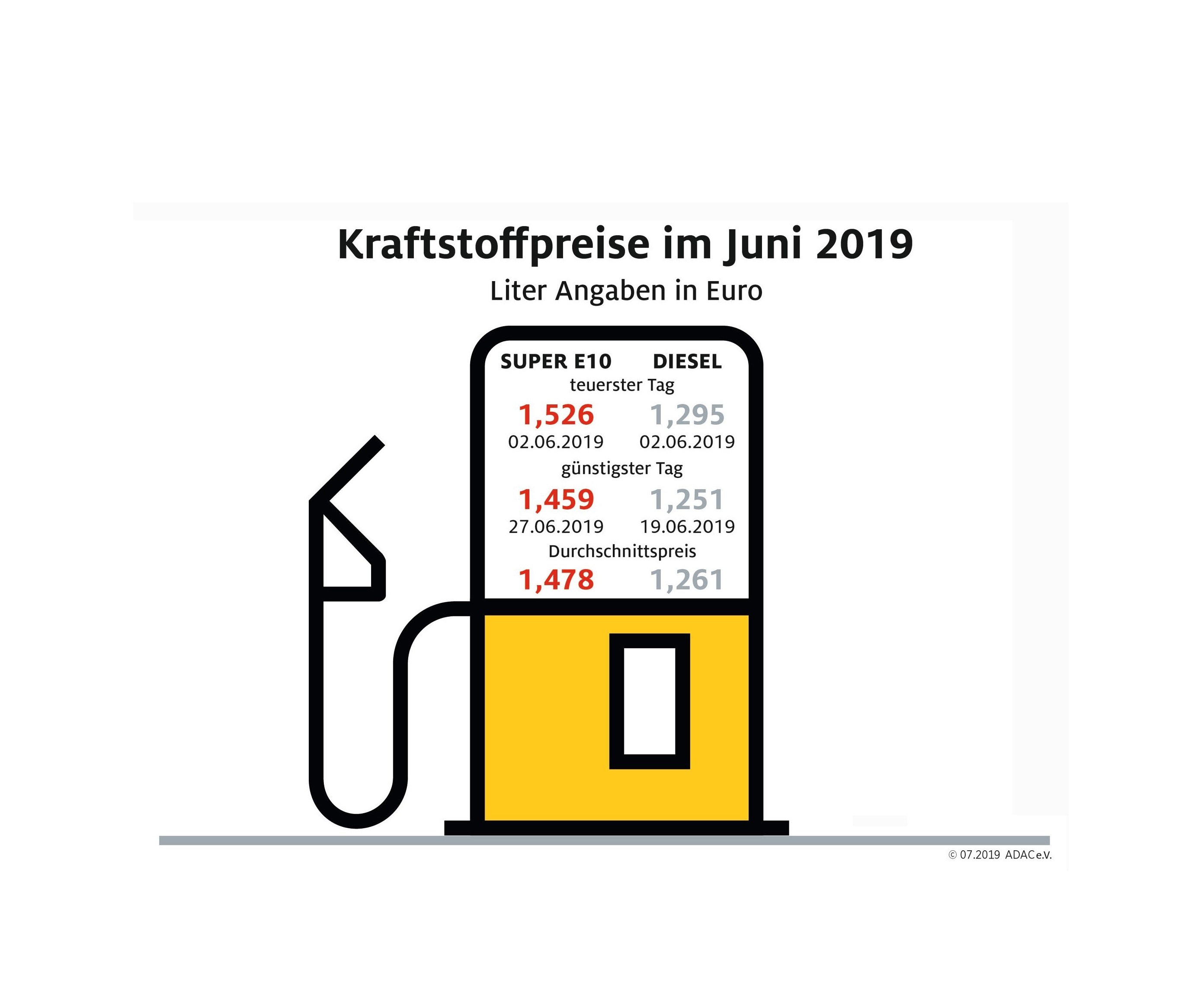 Der teuerste Tanktag war für beide Sorten der 2. Juni. An diesem Tag mussten Autofahrer für einen Liter Super E10 durchschnittlich 1,526 Euro und für einen Liter Diesel 1,295 Euro bezahlen. Am günstigsten war Super E10 mit 1,459 Euro je Liter am 27. Juni, bei Diesel wurde der Monatstiefststand mit 1,251 Euro je Liter am 19. Juni erreicht.
